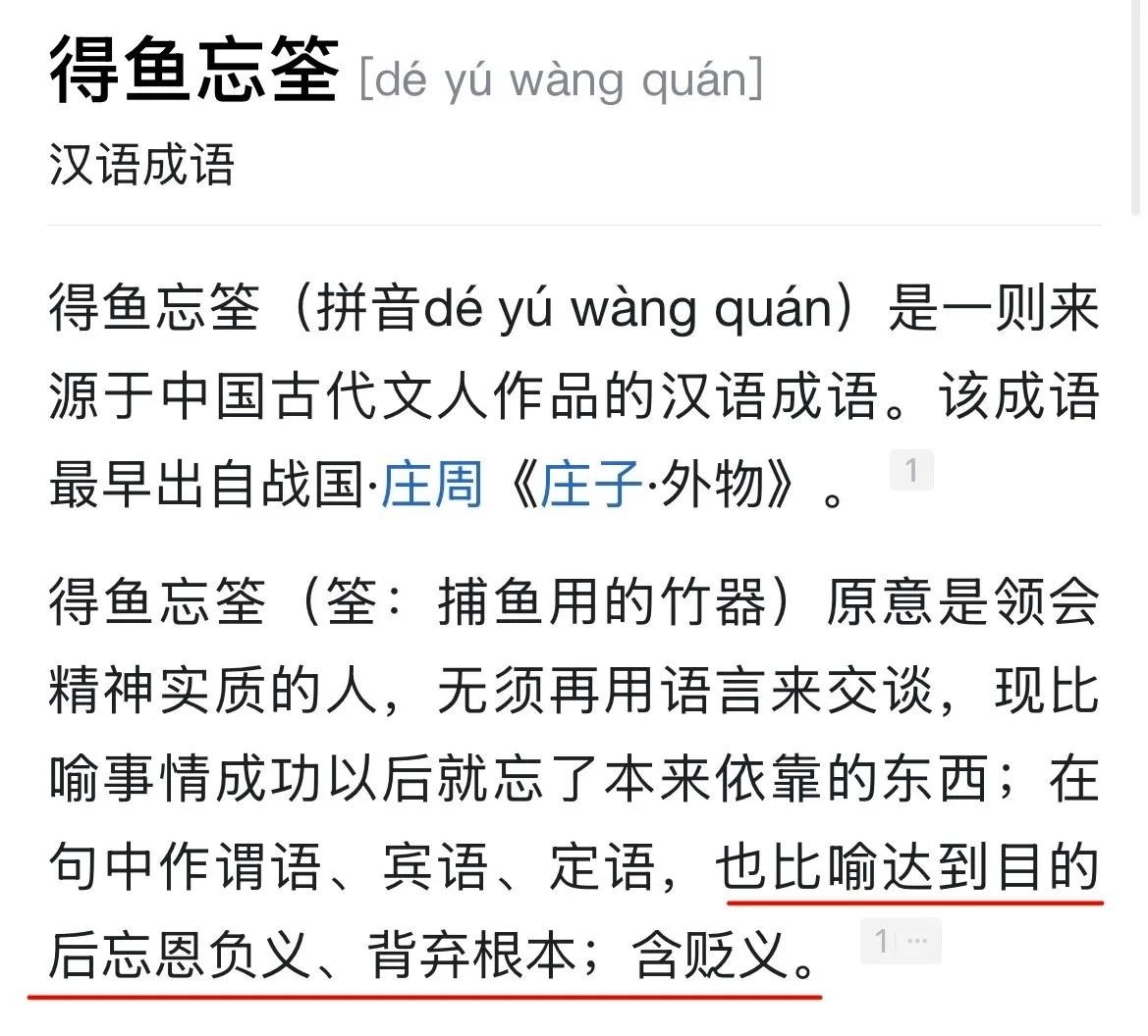她引用了一个冷僻成语“得鱼忘筌”,语义尖锐,充满讽刺意味,配图更是直白传递出“功成之后遭抛弃”的控诉。